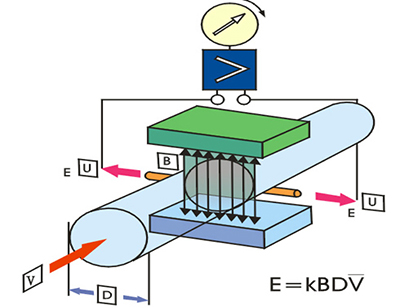 中央空調管道水流量計算表測量原理是基于法拉*電磁感應定律。流量計的側量管是一內襯絕緣材料的非導磁合金短管,兩只電極沿管徑方向穿通管壁固定在測量管上。勵磁線圈由雙向方波脈沖勵磁時,將在與測量管軸線垂直的方向上產生具有一定磁通量密度的工作磁場。此時,如果具有一定電導率的流體流經測量管,將切割磁力線感應出電動勢。電動勢正比于磁通量密度、測量管內徑及流體平均流速的乘積,即E=KBDV